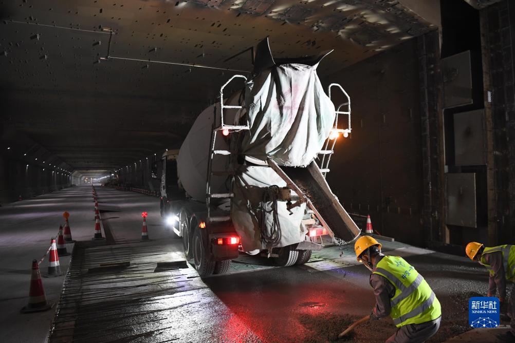 11月28日,工人在深中通道海底沉管隧道内进行最后的压舱混凝土浇筑。