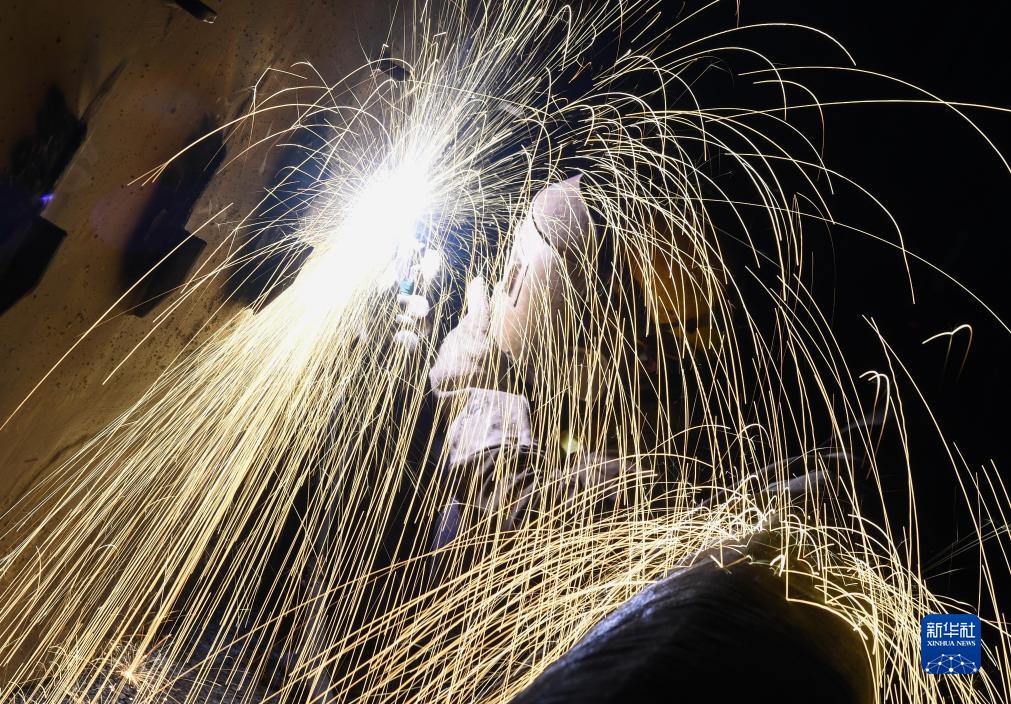 11月27日,工人在深中通道海底沉管隧道内进行切割作业。
