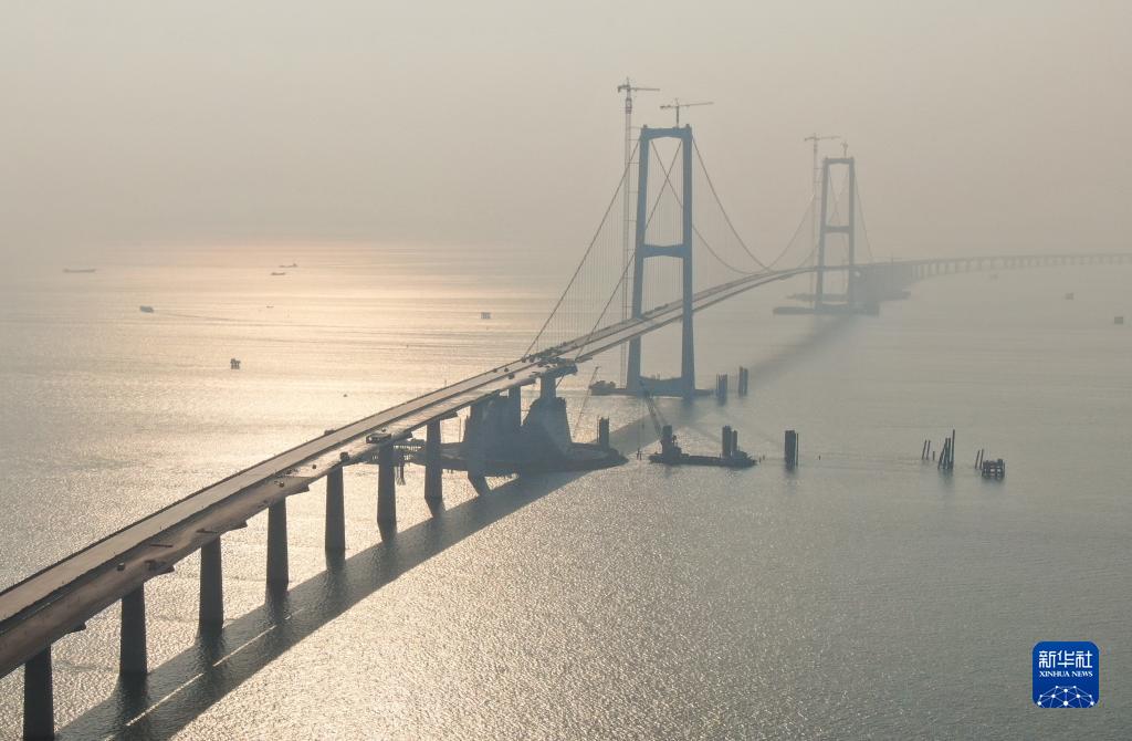 这是夕阳下的深中通道伶仃洋大桥(11月27日摄,无人机照片)。