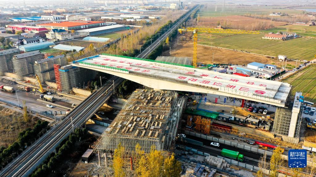 11月28日,由中铁上海局承建的济(宁)曲(阜)快速路上跨京沪铁路立交桥连续梁在转体作业中(无人机照片)。