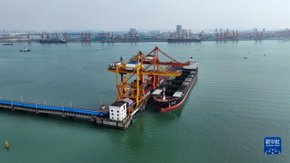 在广西钦州港一处煤码头,货轮在下卸煤炭(11月24日摄,无人机照片)。