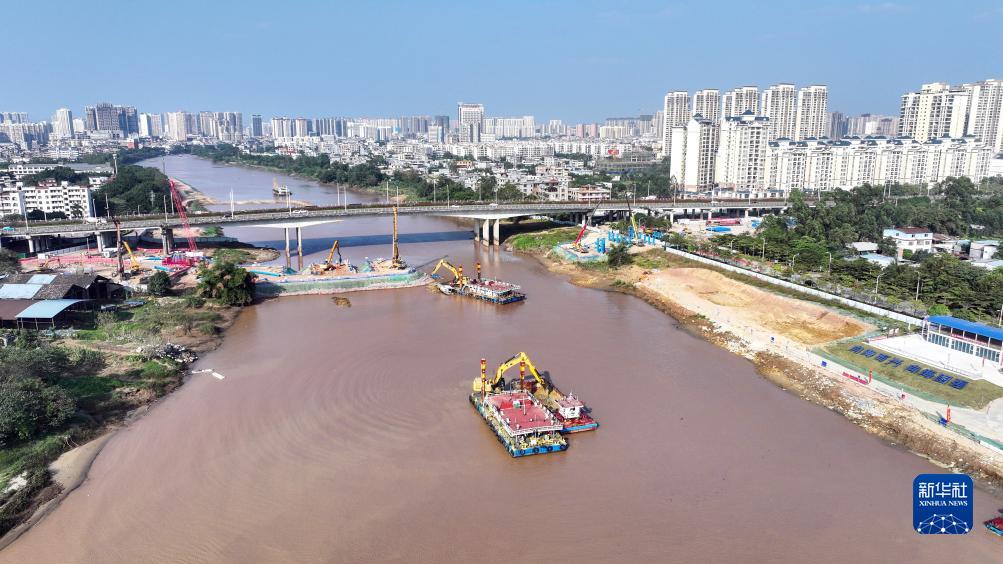 施工船在平陆运河途径钦州市区的航道建设现场作业(11月25日摄,无人机照片)。
