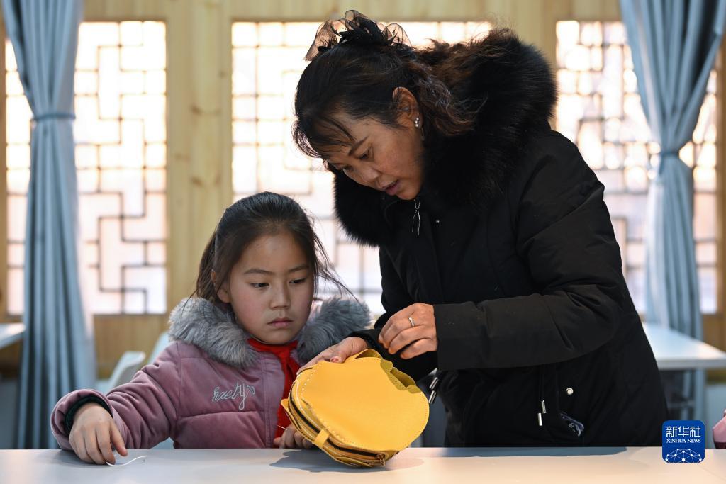 11月29日,在青海省西宁市湟源县城关第一小学,非遗传承人樊国敏(右)在指导学生做皮绣。