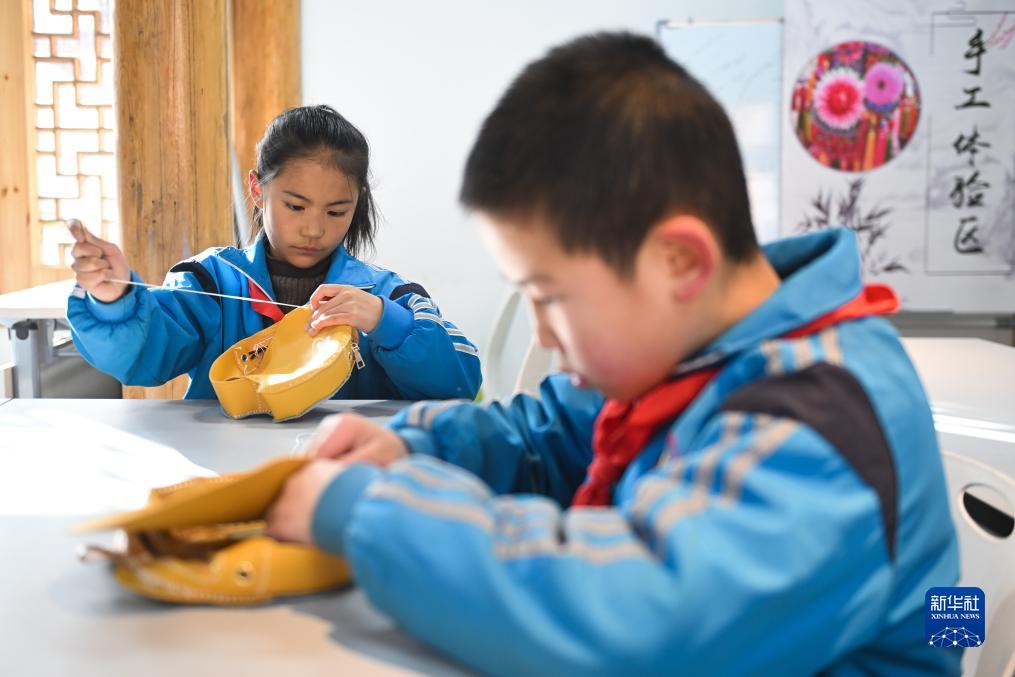 11月29日,在青海省西宁市湟源县城关第一小学,学生在非遗文化课程中体验皮绣。