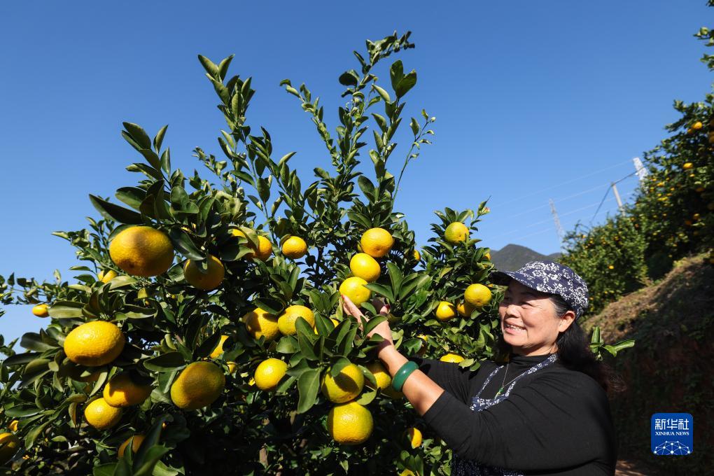 11月28日,在位于浙江省丽水市庆元县黄坛村的外婆家水果专业合作社甜桔柚基地内,果农在采摘成熟的甜桔柚。