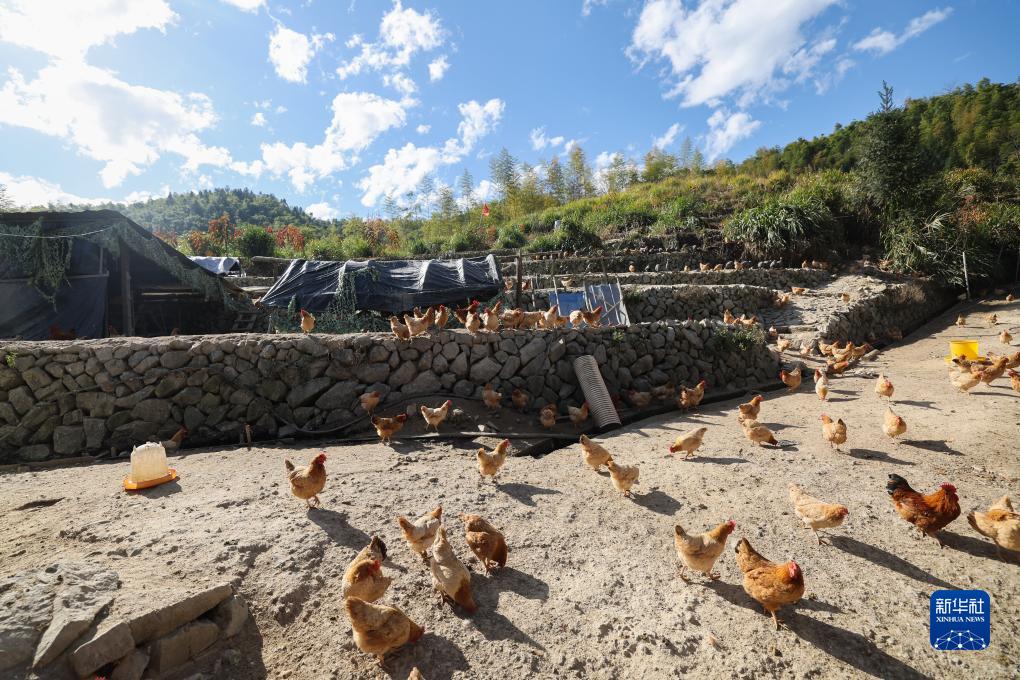 这是11月29日拍摄的庆元县隆宫乡山林中的吴军香家庭农场,该农场采用林禽共育模式,在毛竹林中养殖特色家禽。
