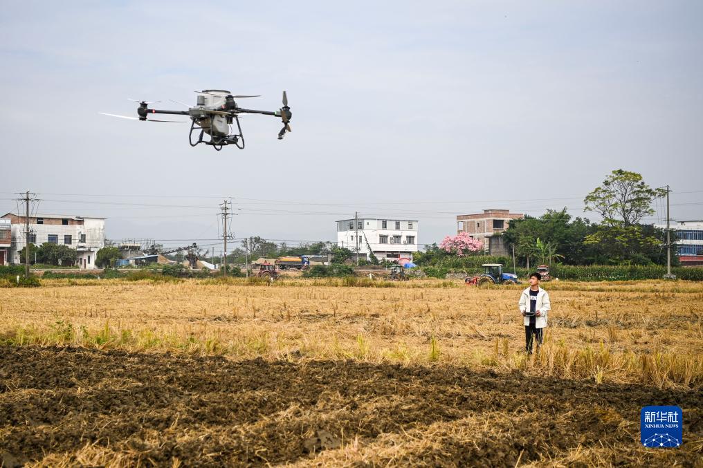 11月29日,在广西贵港市港北区,技术人员操作农用无人机喷洒绿肥。
