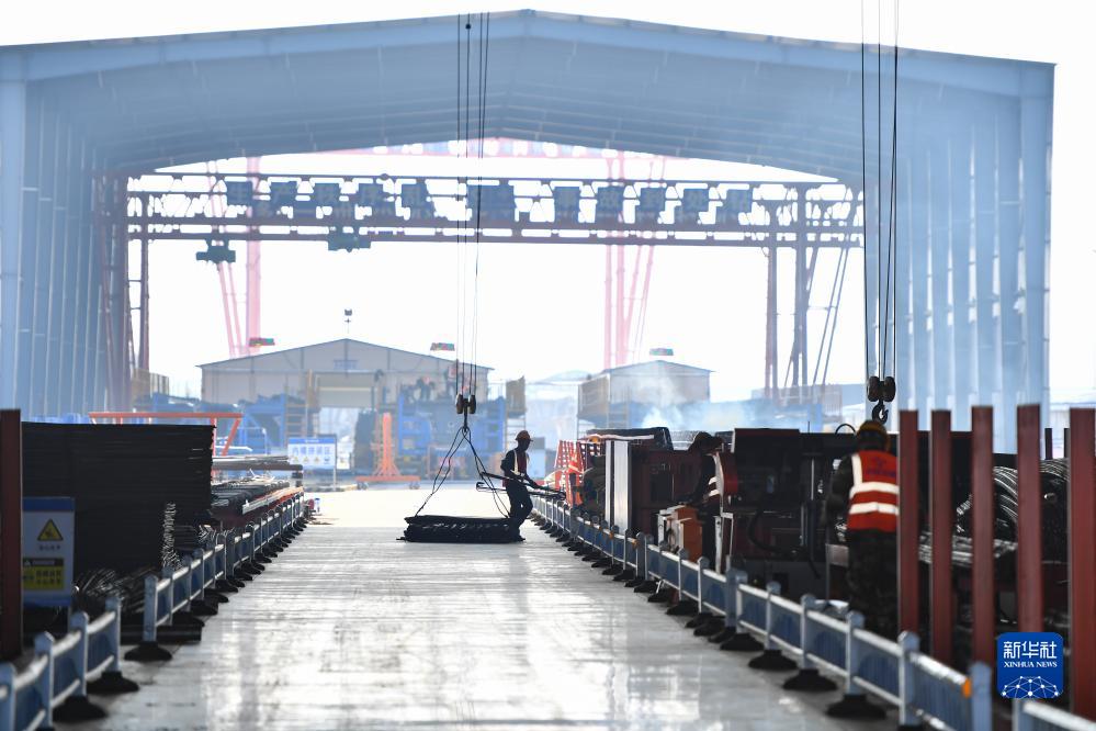 11月29日,工作人员在长沙市暮坪湘江特大桥项目的钢梁加工中心运输材料。