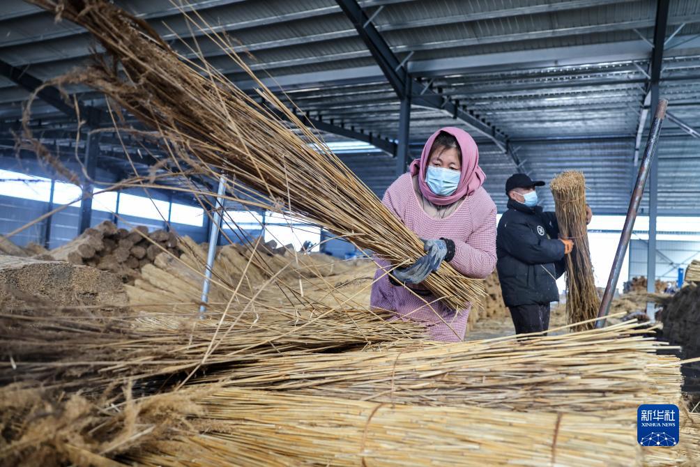11月29日,村民在水湾镇芦苇产业园内整理芦苇。