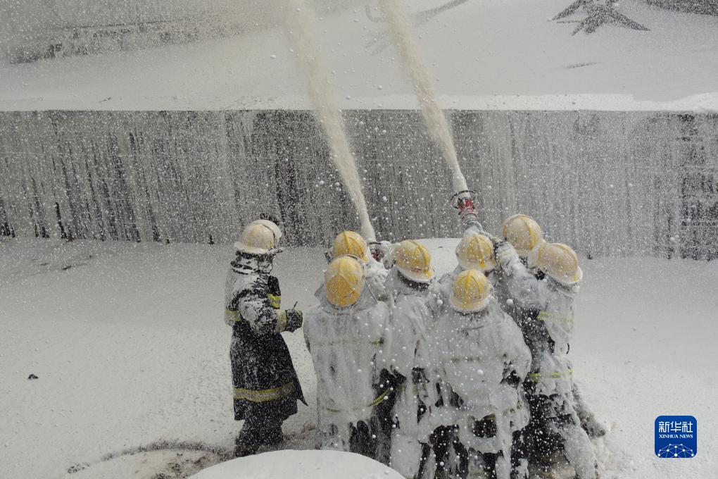宝塔消防救援站消防员处置延安炼油厂火灾(2014年4月26日摄)。
