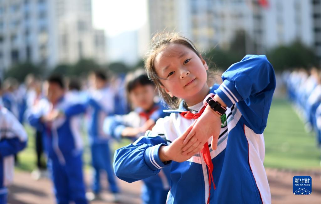 11月29日,学生在贵州省遵义市正安县第二完全小学做课间操。