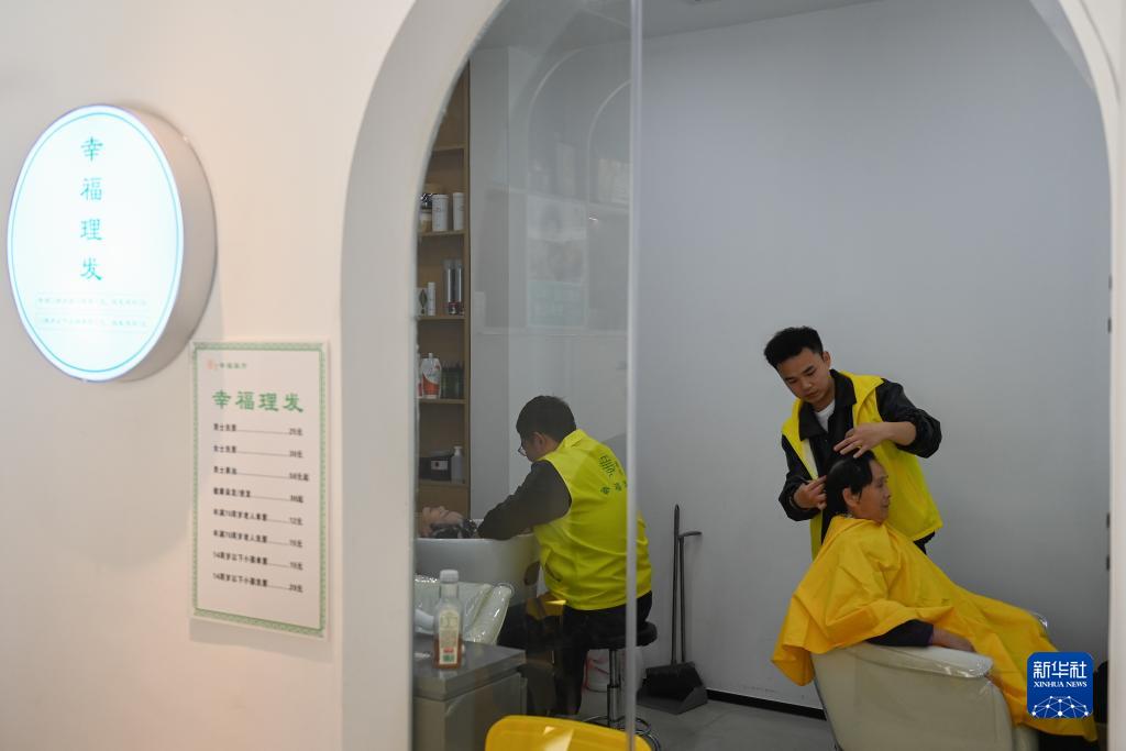 11月29日,社区居民在舟山市定海区“幸福客厅”内理发。