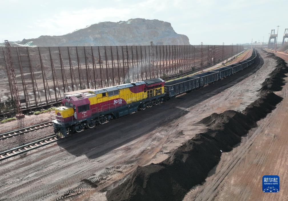 11月29日拍摄的在福建莆田湄洲湾港罗屿作业区装运铁矿石的海铁联运班列。