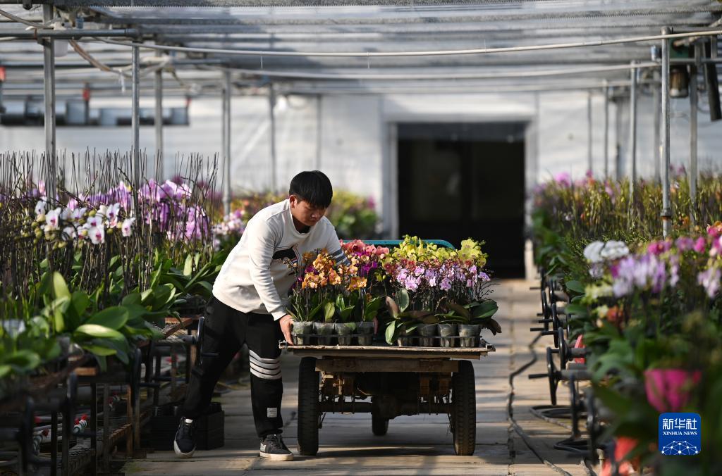 11月29日,工人在温室里搬运蝴蝶兰。