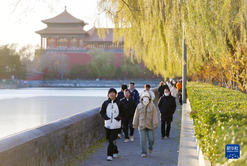 11月29日,游客在故宫筒子河旁走过。