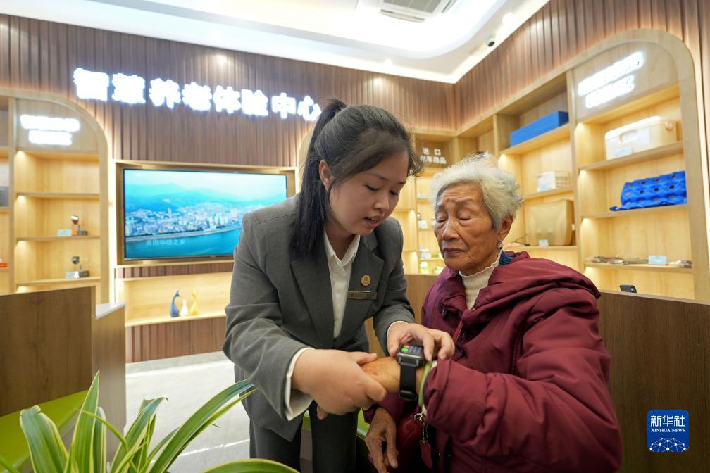 11月29日,在丽水市青田县油竹街道居家养老中心,养老管家为老人佩戴智能手表,用于监测日常血压、心率。