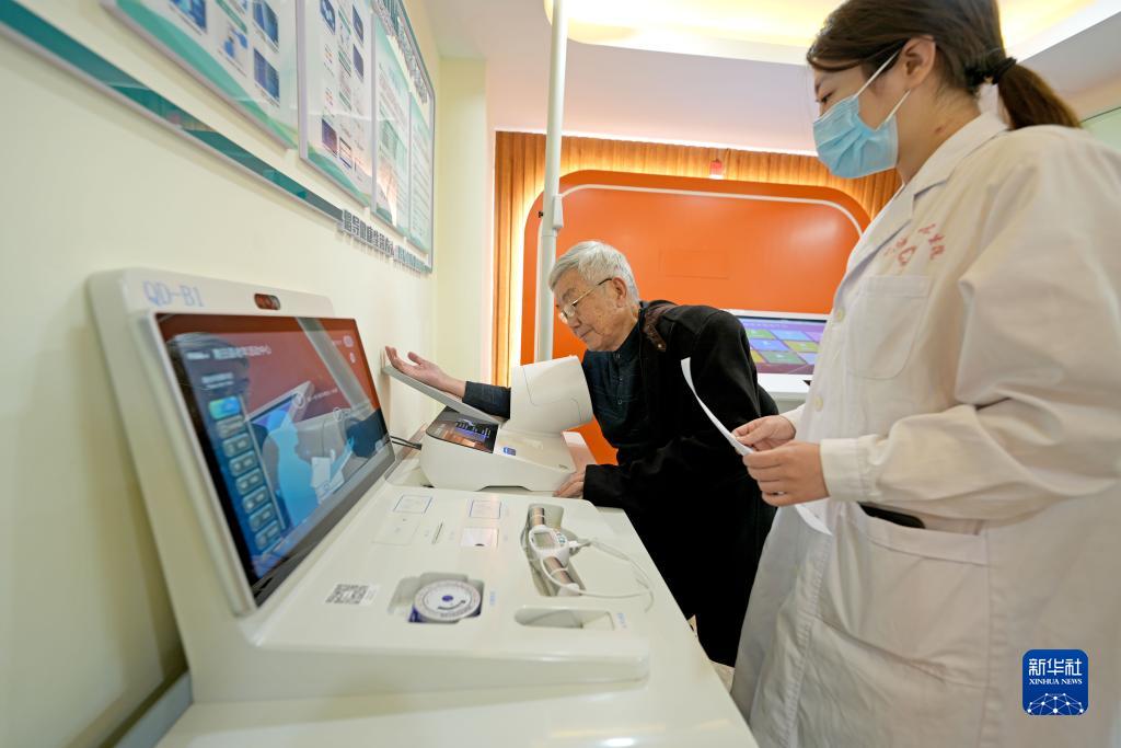 11月29日,在丽水市青田县鹤城街道居家养老服务中心,鹤城中心卫生院的医护人员用健康一体机为老人测血压。