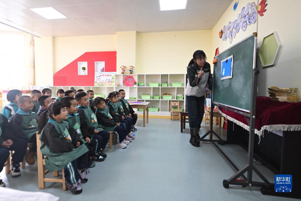 11月29日,青海省西宁市湟源县幼儿园的小朋友在上美术课。