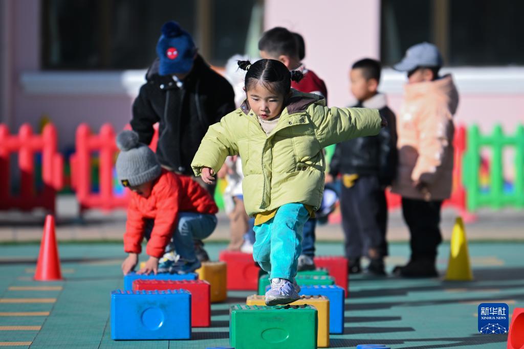 11月29日,青海省西宁市湟源县幼儿园的小朋友在上户外活动课。