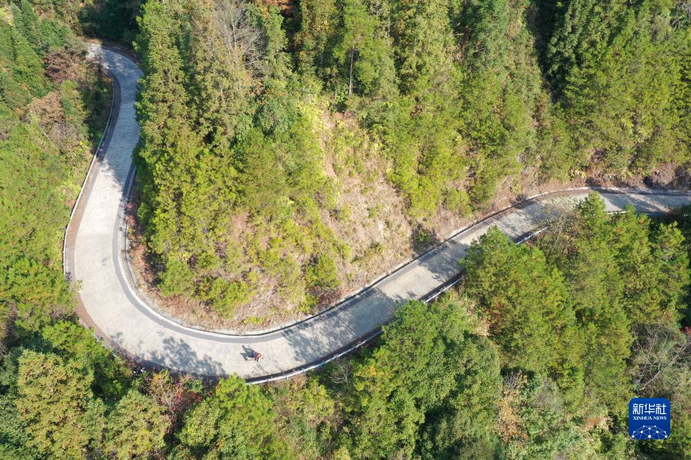 11月29日,在广西龙胜各族自治县龙脊镇,潘从汉老师骑着摩托车前往满田小学(无人机照片)。