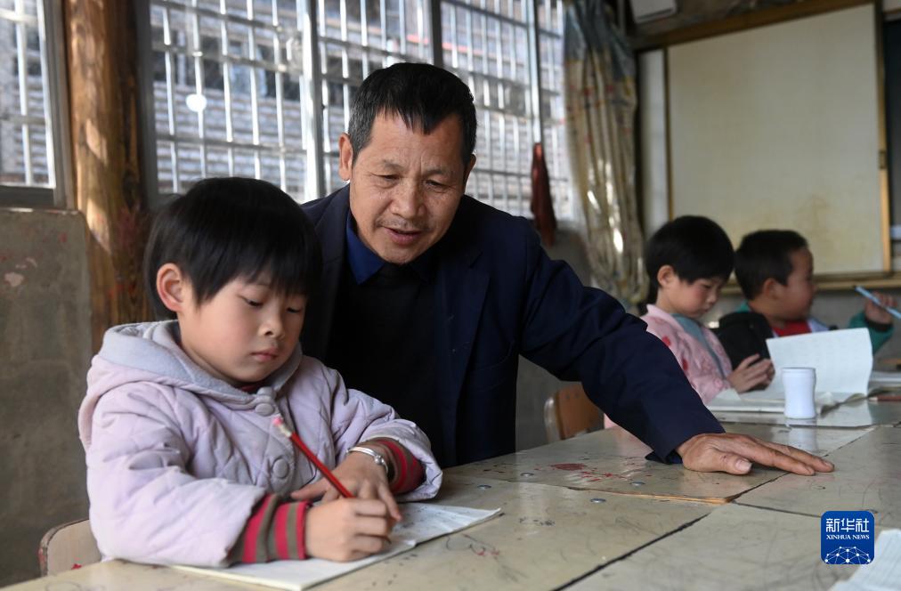11月29日,广西龙胜各族自治县龙脊镇满田小学的潘从汉老师在课堂上辅导一名学生功课。