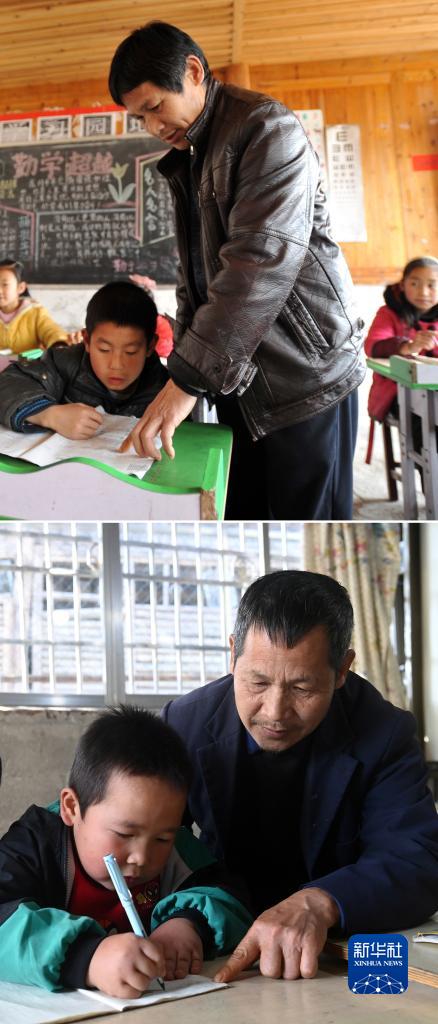 拼版照片:上图为时任广西龙胜各族自治县龙脊镇小寨小学教师的潘从汉老师在课堂上辅导学生功课(2014年3月13日摄);下图为广西龙胜各族自治县龙脊镇满田小学的潘从汉老师在课堂上辅导学生功课(2023年11月29日摄)。