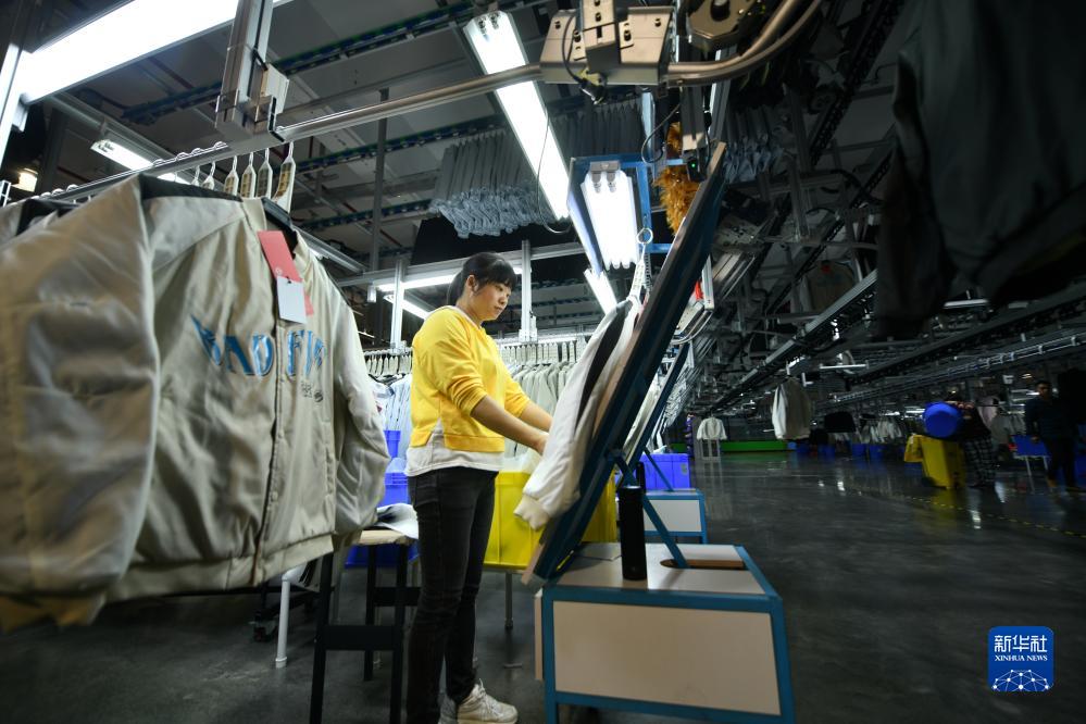 11月30日,在广西北流市“玉商回归产业园”一家服装生产企业,工人在生产线上作业。