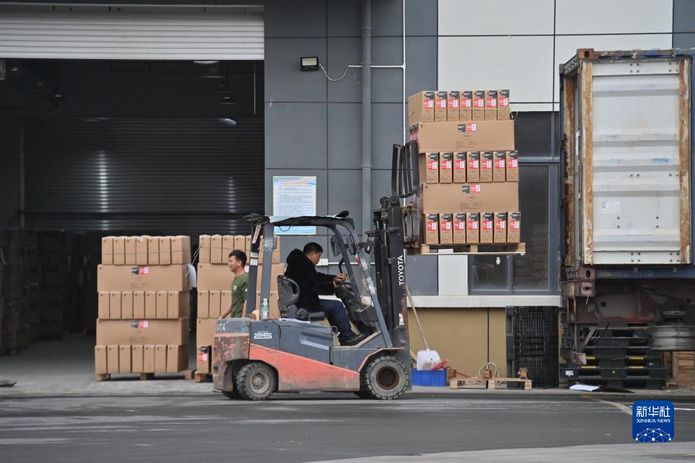 11月30日,在广西北流市“玉商回归产业园”一家玩具生产企业,工人在搬运产品。