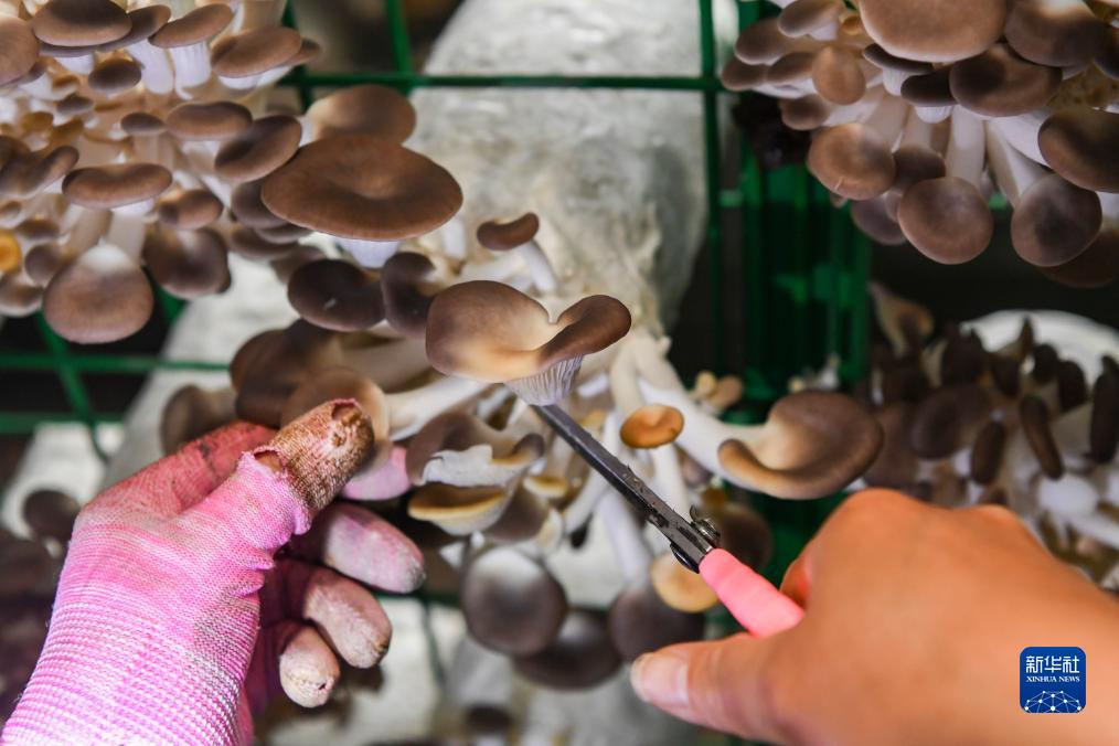 11月29日,何埂镇丰乐村一食用菌种植企业工作人员在采收秀珍菇。