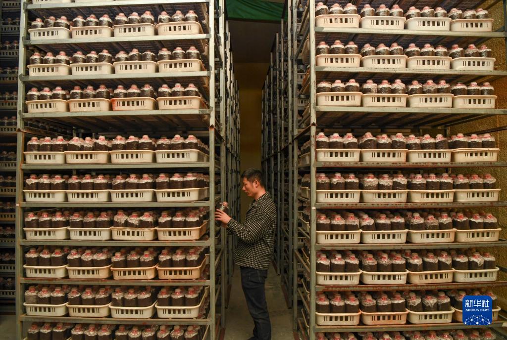 11月29日,何埂镇丰乐村一食用菌种植企业工作人员在养菌房查看菌丝生长情况。