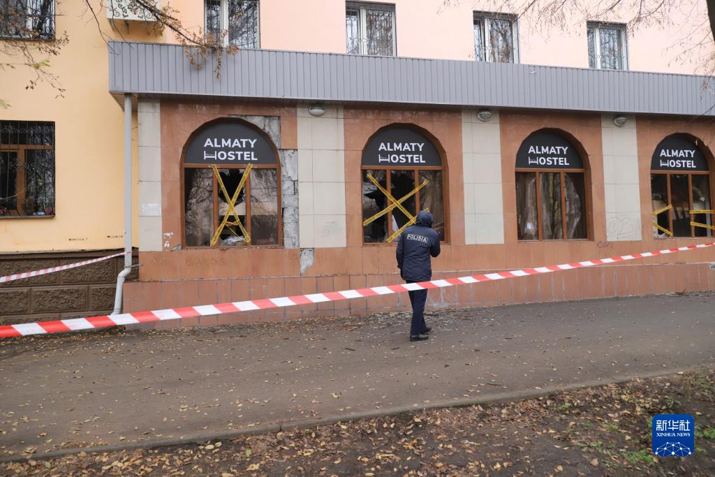 11月30日,在哈萨克斯坦阿拉木图市,安全人员在发生火灾的旅店进行善后工作。