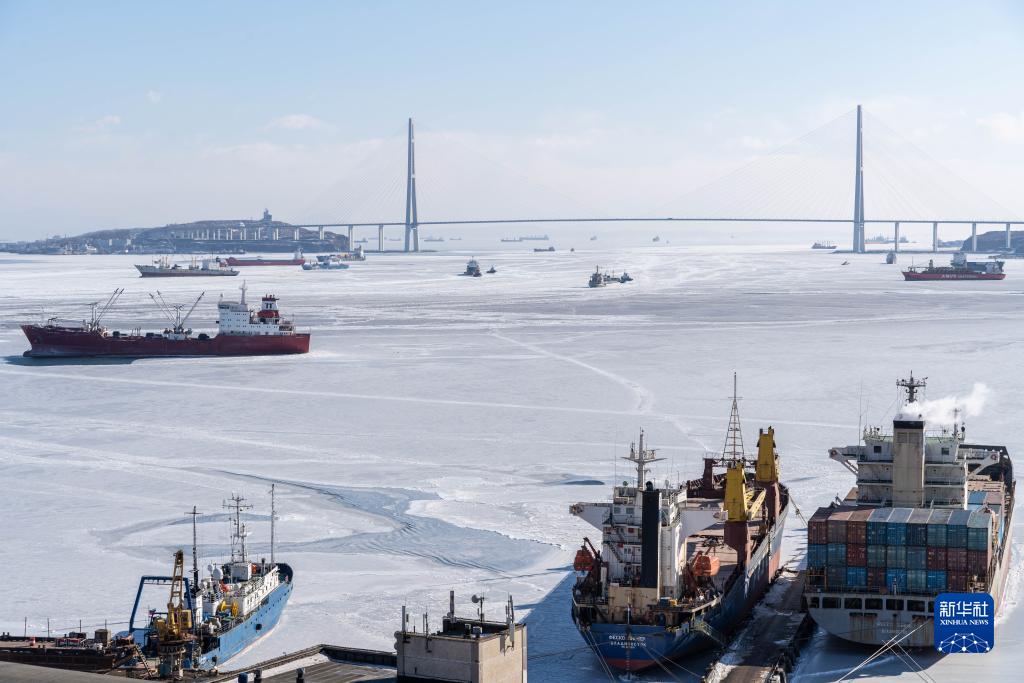 这是2023年1月24日拍摄的俄罗斯符拉迪沃斯托克金角湾冰冻的海面。俄罗斯远东地区1月遭遇寒潮,部分地区大幅降温。符拉迪沃斯托克1月24日最低气温达零下27.6摄氏度,突破了当地百年来同期气温最低记录。
