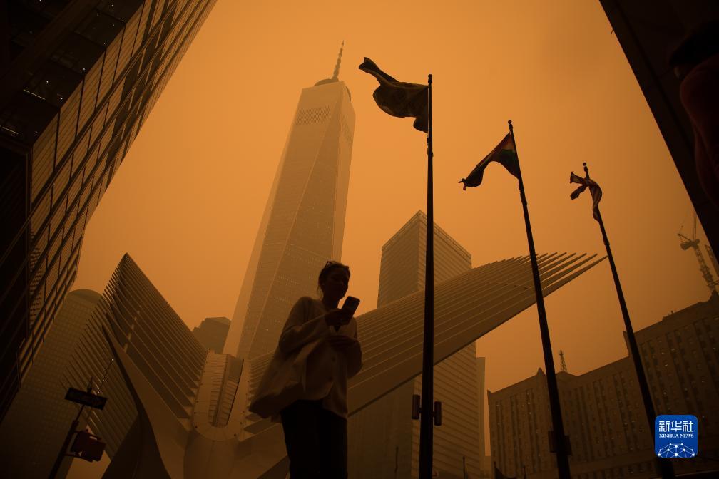 2023年6月7日,一名行人从烟尘笼罩的美国纽约曼哈顿世贸中心附近走过。加拿大多地森林野火产生的大量烟霾南移,美国纽约市空气出现严重污染,民众生活受到影响。