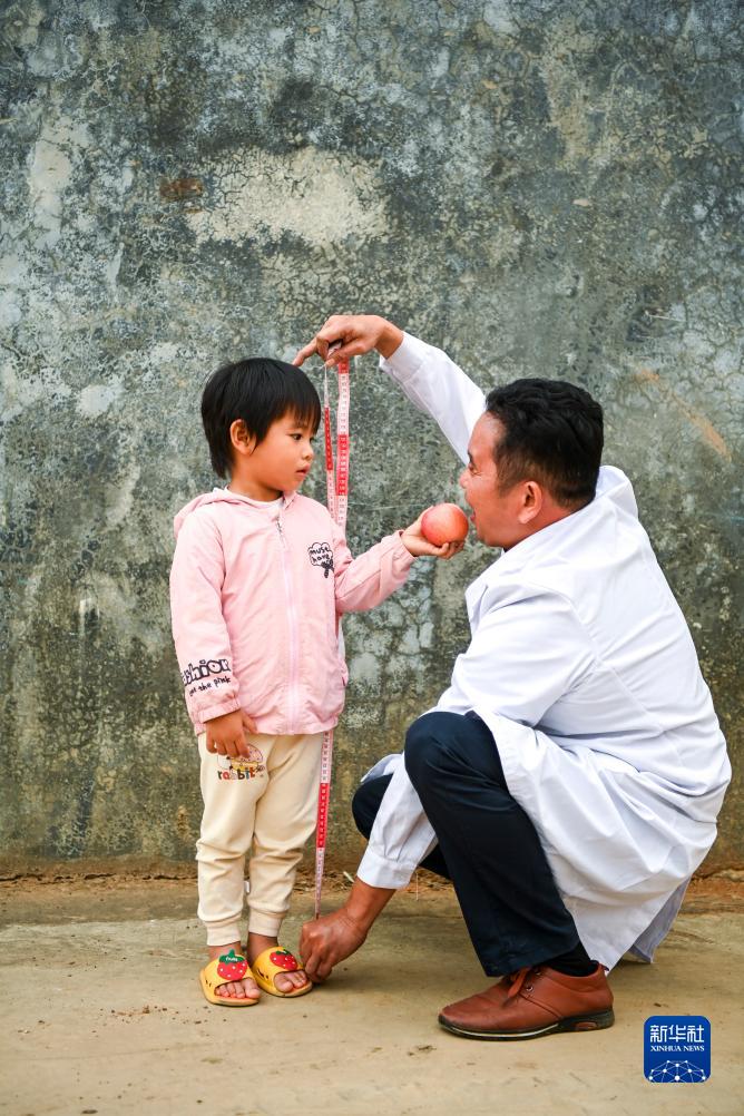11月29日,黄增亮(右)为村民家的孩子测量身高。
