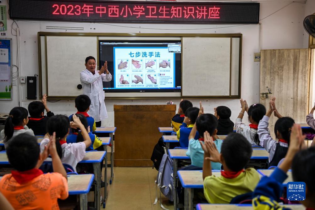11月29日,黄增亮在村里的小学教孩子们学习七步洗手法。