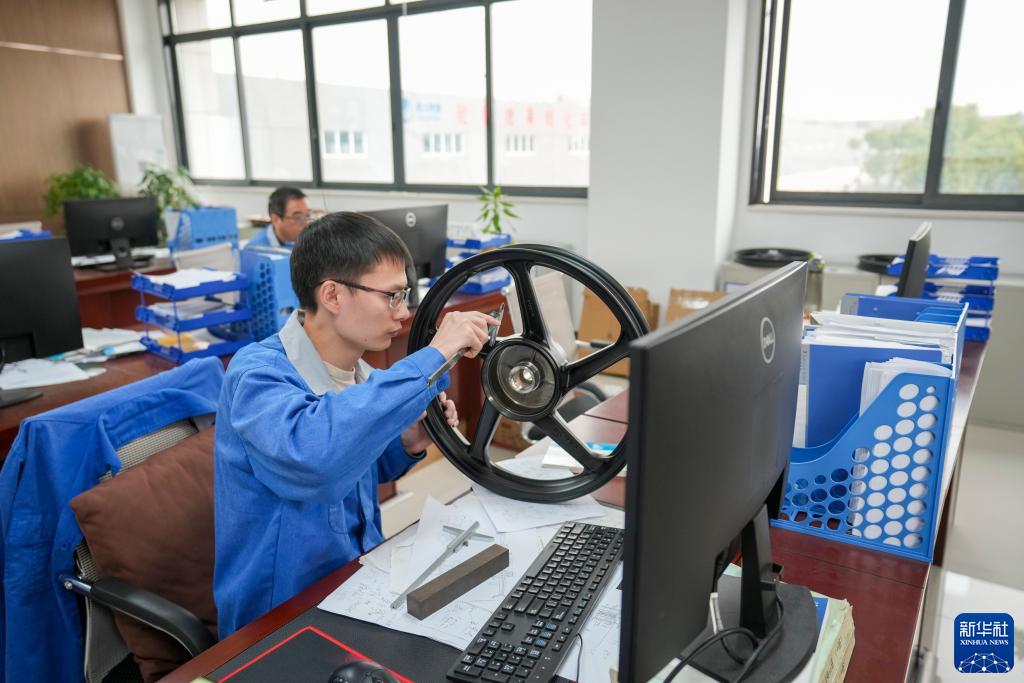 11月28日,在重庆垫江县重庆捷力轮毂制造有限公司的研发中心,一名科研人员研究摩托车轮毂产品的改进。