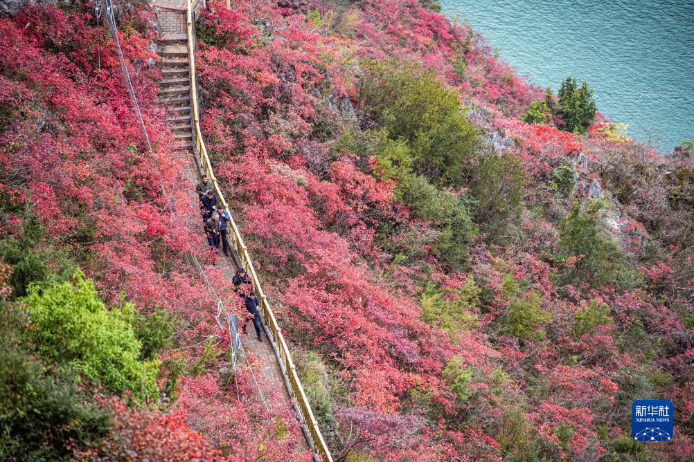 初冬时节,长江三峡重庆市巫山县水域两岸色彩斑斓,红叶似火,美如画卷。