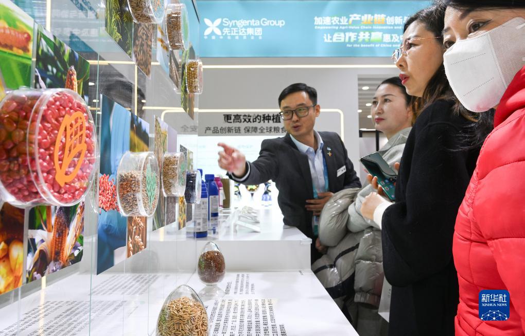 11月30日,在链博会绿色农业链展区,参观者在先正达集团展台前向工作人员(左一)了解种子研发情况。