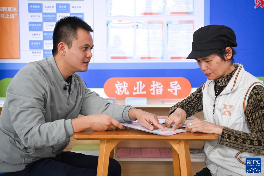 11月30日,在贵港市港北区一家“就业超市”,工作人员(左)为前来咨询的群众介绍招聘信息。