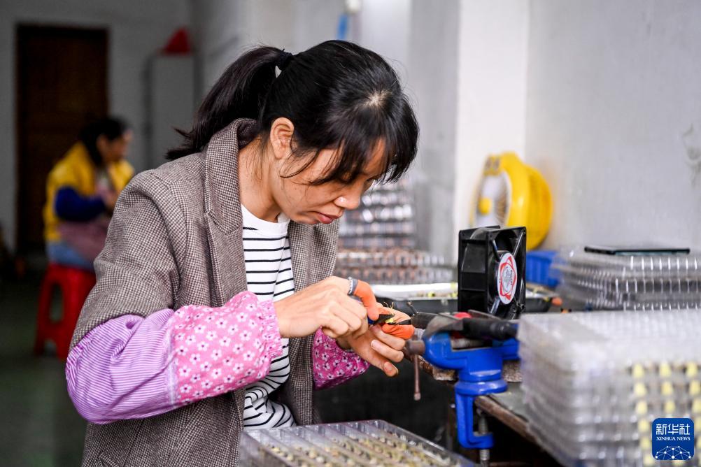 11月30日,在贵港市港北区一家就业帮扶车间,当地群众在加工电子配件。