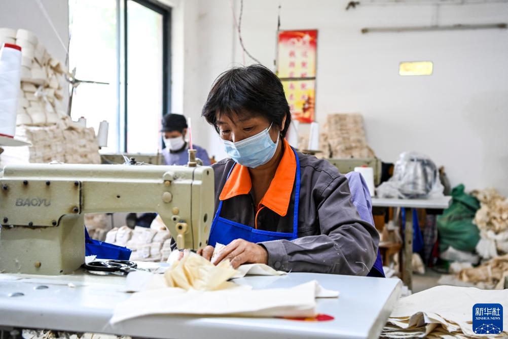 11月30日,在贵港市港北区一家就业帮扶车间,当地群众在加工劳保用品。