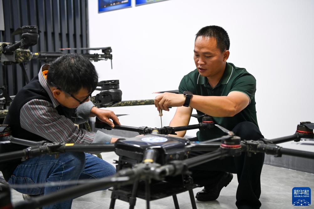 11月30日,在贵港市港北区一处创业孵化园区,一个植保无人机服务创业团队的工作人员在维修无人机。