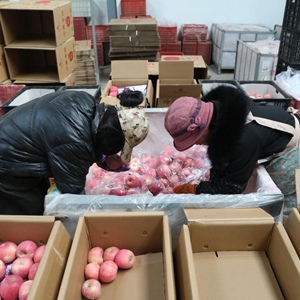 11月30日,在庆城县白马铺镇白马铺村的一处果业农民专业合作社,工作人员在苹果分拣包装线上作业。