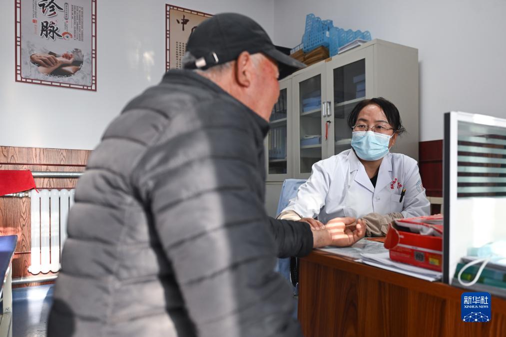 11月30日,青海省海东市化隆回族自治县医共体成员单位群科镇中心卫生院医师张学琴为就诊患者把脉。