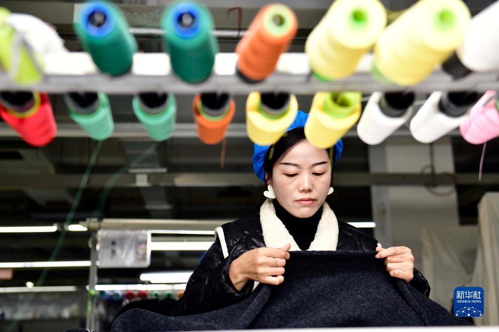 11月30日,在巨野万丽服饰有限公司,工作人员在检查成衣质量。