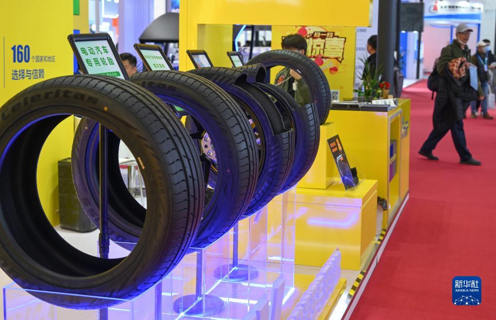 在智能汽车链展区,山东华盛橡胶有限公司展台展示电动汽车专用轮胎(11月30日摄)。