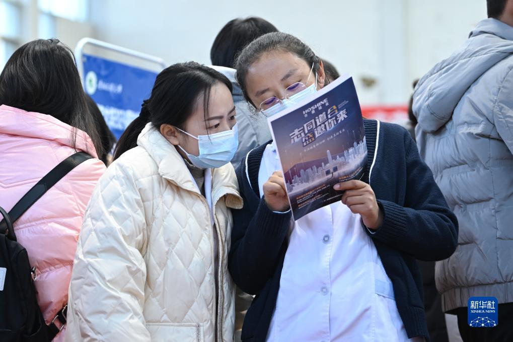 12月1日,两名学生在校园招聘会查看企业招聘需求。