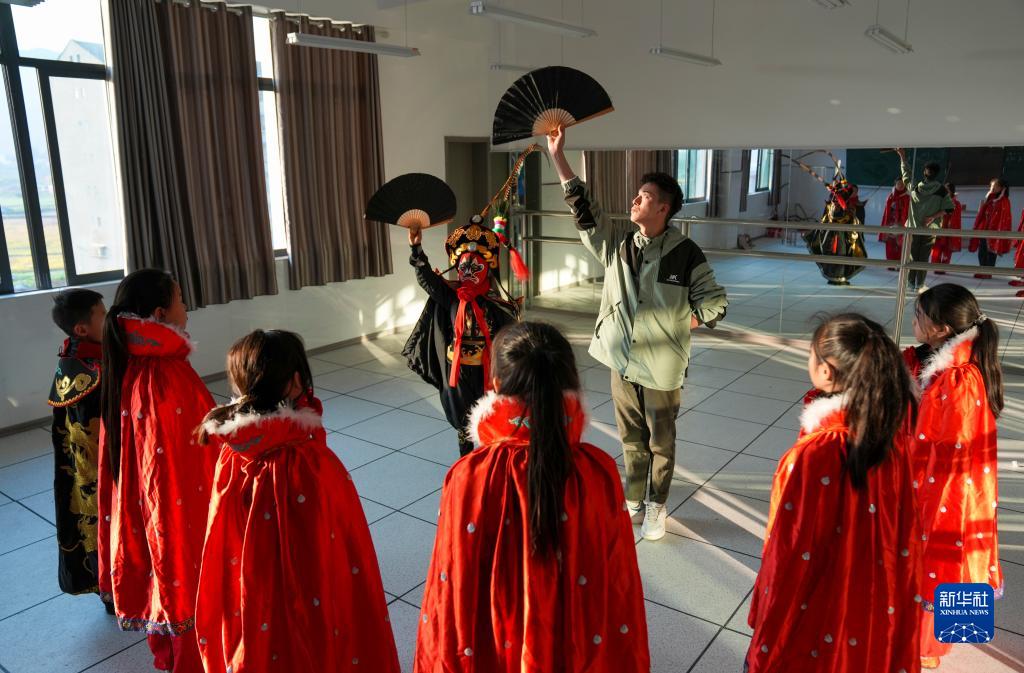 11月28日,在垫江县武安小学校的舞蹈室内,民间艺人李勇(后排右一)为学生进行川剧变脸表演中的动作示范。