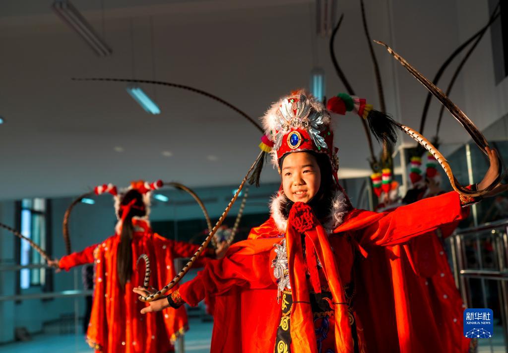 11月28日,在垫江县武安小学校的舞蹈室内,学生穿戴好全套戏服后练习川剧变脸基本表演动作。