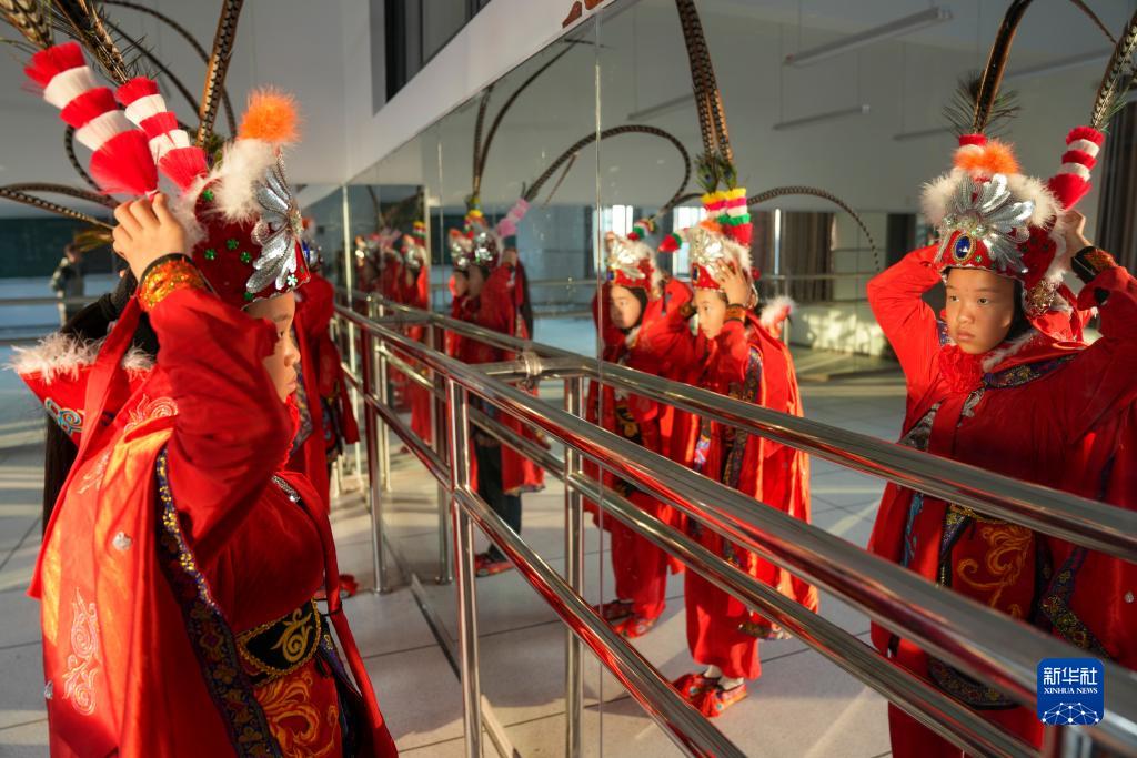 11月28日,在垫江县武安小学校的舞蹈室内,学生们对着镜子整理头饰。